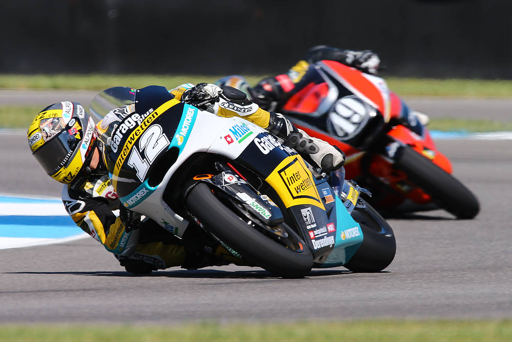 En signant le neuvième chrono de la première journée d'essais libres du GP d'Indianapolis Moto2, Thomas Lüthi (Derendinger Racing Interwetten) a réussi la meilleure performance suisse du jour dans le temple des sports mécaniques yankees, le "Speedway" d'Indianapolis. Malgré une chute ce matin - conséquences d'un souci de boîte de vitesses -, Lüthi a pu reprendre la piste assez rapidement, son équipe technique ayant réussi un petit miracle en réparant sa Kalex. Très bon en matinée et quatorzième sur l'ensemble des deux séances, Dominique Aegerter (Technomag Racing Interwetten) a lui aussi encore du pain sur la planche, mais sa constance dans la performance est déjà intéressante. Bonne journée aussi pour le troisième pilote de la "dream team" suisse de la moto, Robin Mulhauser (Technomag Racing Interwetten), 23e chrono. Premier bilan de cette seconde partie du championnat, avec Fred Corminboeuf, le patron des deux structures: "Très bon début de journée avec Dominique. Cet après-midi, en suivant un plan de travail préétabli, nous sommes malheureusement partis dans la mauvaise direction technique, quand bien même la température est sérieusement montée. Domi est à 9 dixièmes de la pole et je sais qu'il peut réussir un gros truc samedi lors des qualifications. Robin a eu une mise en train plus difficile, mais il a progressé cet après-midi: nous voulons qu'il passe à la vitesse supérieure en cette deuxième partie de championnat; donc le but est le top 20 aux qualifications puis, ces fameux premiers points en course. Quant à Tom, il a immédiatement eu de bonnes sensations ce matin, il occupait la tête de la hiérarchie quand il est tombé assez lourdement; cet après-midi, il a amélioré beaucoup de choses. Reste à effacer les quelques dixièmes qu'il perd encore dans le secteur où il a connu son souci ce matin."